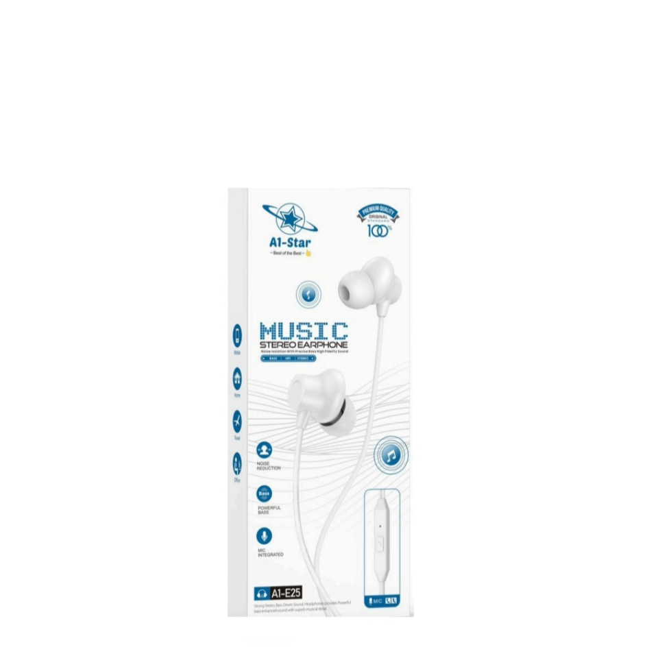 "Enjoy music and calls with the A1Star A1-E25 Wired Earphone, crafted for clarity, comfort, and durability. With balanced audio and enhanced bass, it ensures an enjoyable sound experience. The in-line mic with one-button control makes handling calls and music effortless, while the lightweight, ergonomic design provides a comfortable fit for daily use. Compatible with all devices featuring a 3.5mm audio jack, the A1-E25 is the perfect wired earphone for work, study, and entertainment."
